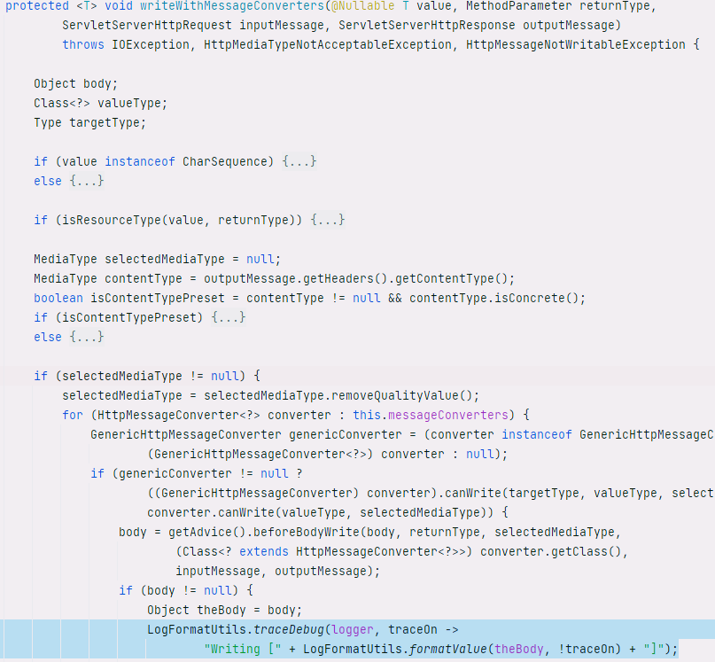 ▶ AbstractMessageConvertMethodProcessor Class 의 writeWithMessageConverts 메서드에서 출력한다.