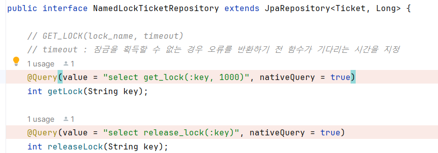 int lockResult = namedLockTicketRepository.getLock(Long.toString(id));