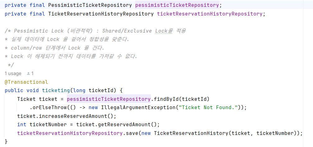 ▶ 2. PessimisticTicketRepository 객체로 데이터를 조회해서 수정한다.