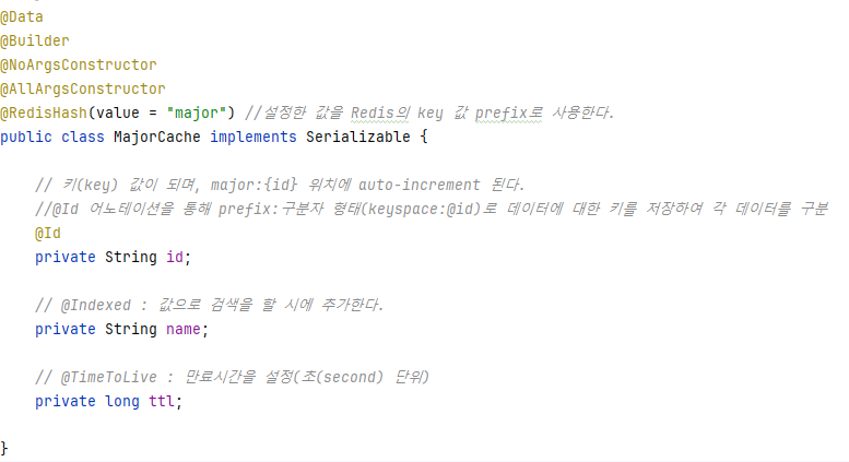 4. @TimeToLive : TTL을 적용 => TimeToLive에 적용되는 시간은 '초' 단위이며, default 값은 -1L