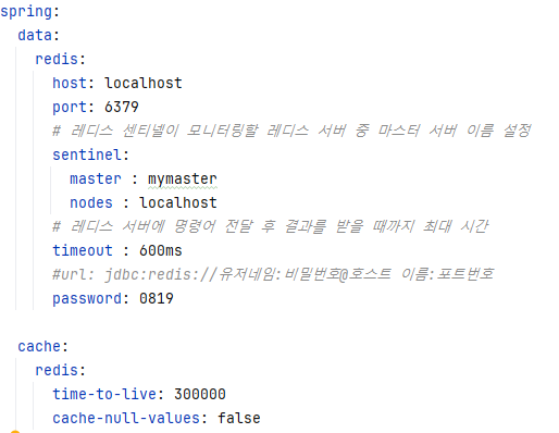 | RedisSentinelConfiguration | Sentinel 구조로 구성된 레디스 서버에 연결 설정 |