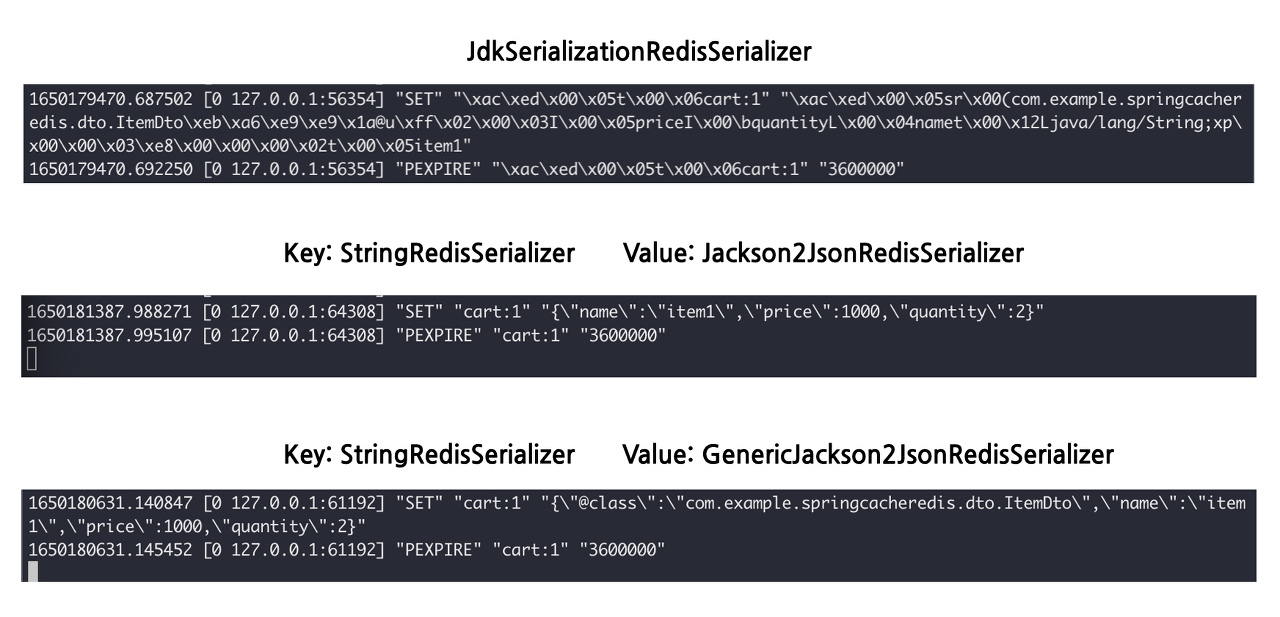 : 위 설정에서는 StringRedisSerializer 를 사용하여 문자열로 된 키를 직렬화하고, GenericJackson2JsonRedisSerializer 를 사용하여 일반적인 객체를 JSON 형식으로 직렬화했다.