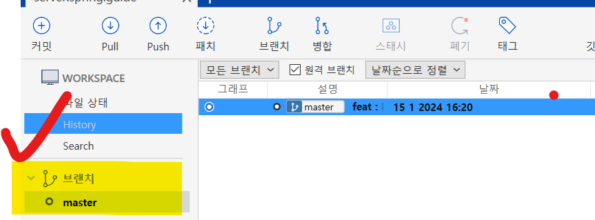 커밋이 성공적으로 실행되면, 왼쪽 브랜치에 master 가 추가된 것을 확인 할 수 있다.