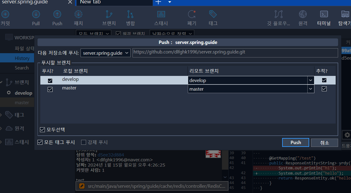 1. 푸시할 브랜치(branch) 를 선택하고 push 버튼을 클릭한다.