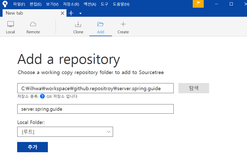 이후 하단의 '추가'버튼을 누르면, 소스트리에 해당 로컬저장소가 등록된다.
