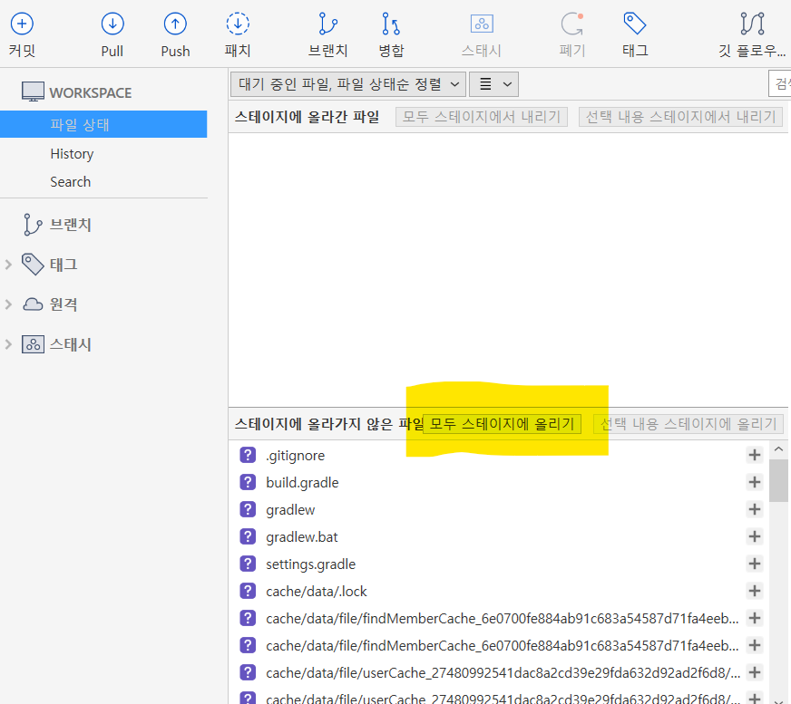 2) 프로젝트 파일들 스테이지에 올리기 (* git add)