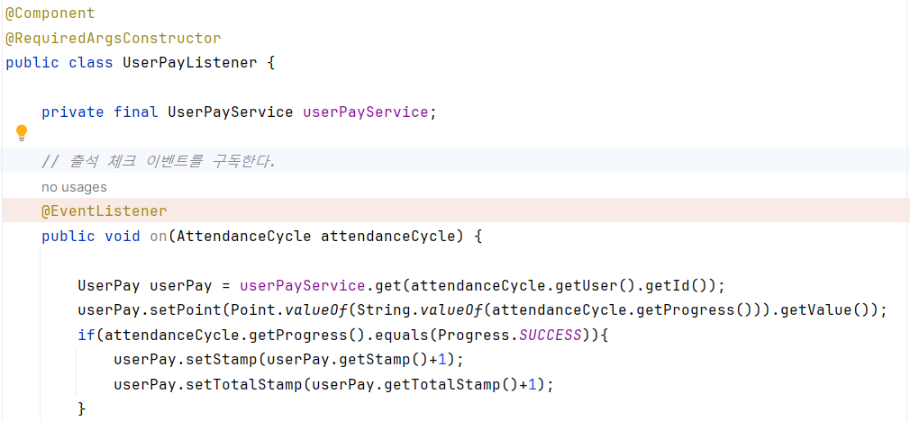코드를 보면, 출석일자를 저장하는 add 메서드에 많은 책임이 부여된 것을 볼 수 있다. 포인트도 적립해야되고, 스탬프도 적립시키고, 본인의 관련 도메인 외에 다른 도메인 작업까지 하고 있다. 그 결과 AttendanceCycleService 에 포인트, 스탬프 관련 의존성 주입이 필요해지고 이런 의존성들 사이에서 강한 결합 관계가 발생하게 된다.