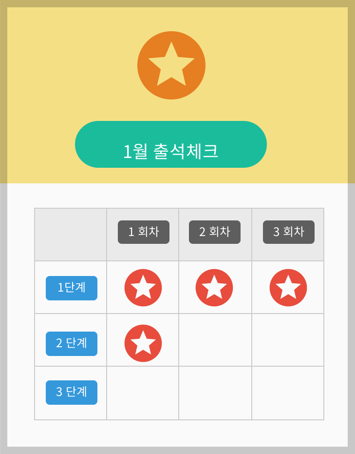 ex. (1단계 1회차 시작일: 1/1) => (1단계 2회차 출석체크 1/3) => 결과 : 1단계 실패
