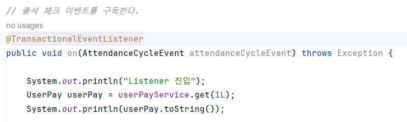 왜냐하면 같은 트랜잭션으로 묶여있는 상황에서 이전의 이벤트를 publish 하는 코드에서 트랜잭션이 이미 커밋 되었기 때문이다.