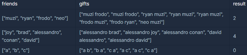 public int solution(String[] friends, String[] gifts) {