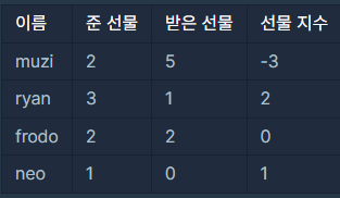 참고 : 주고받은 선물과 선물 지수를 표로 나타내면 아래와 같다.
