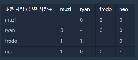 3. 선물을 준 사람과 선물받은 사람, 선물 준 개수 카운팅