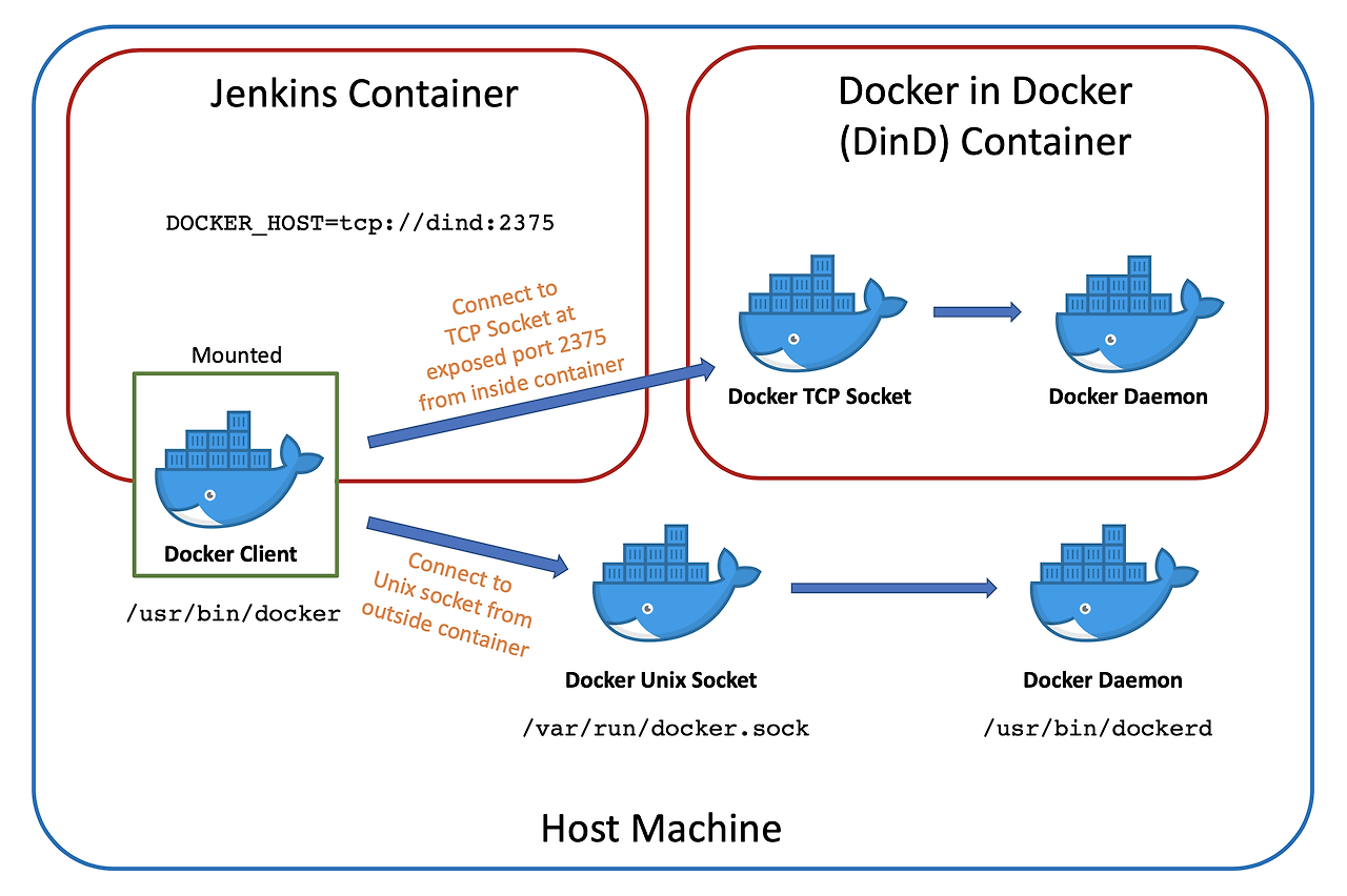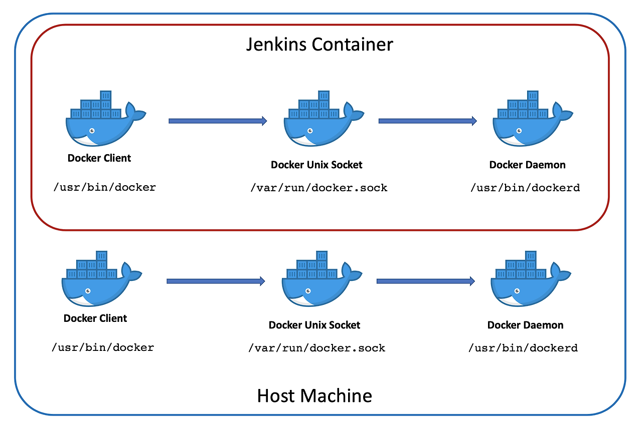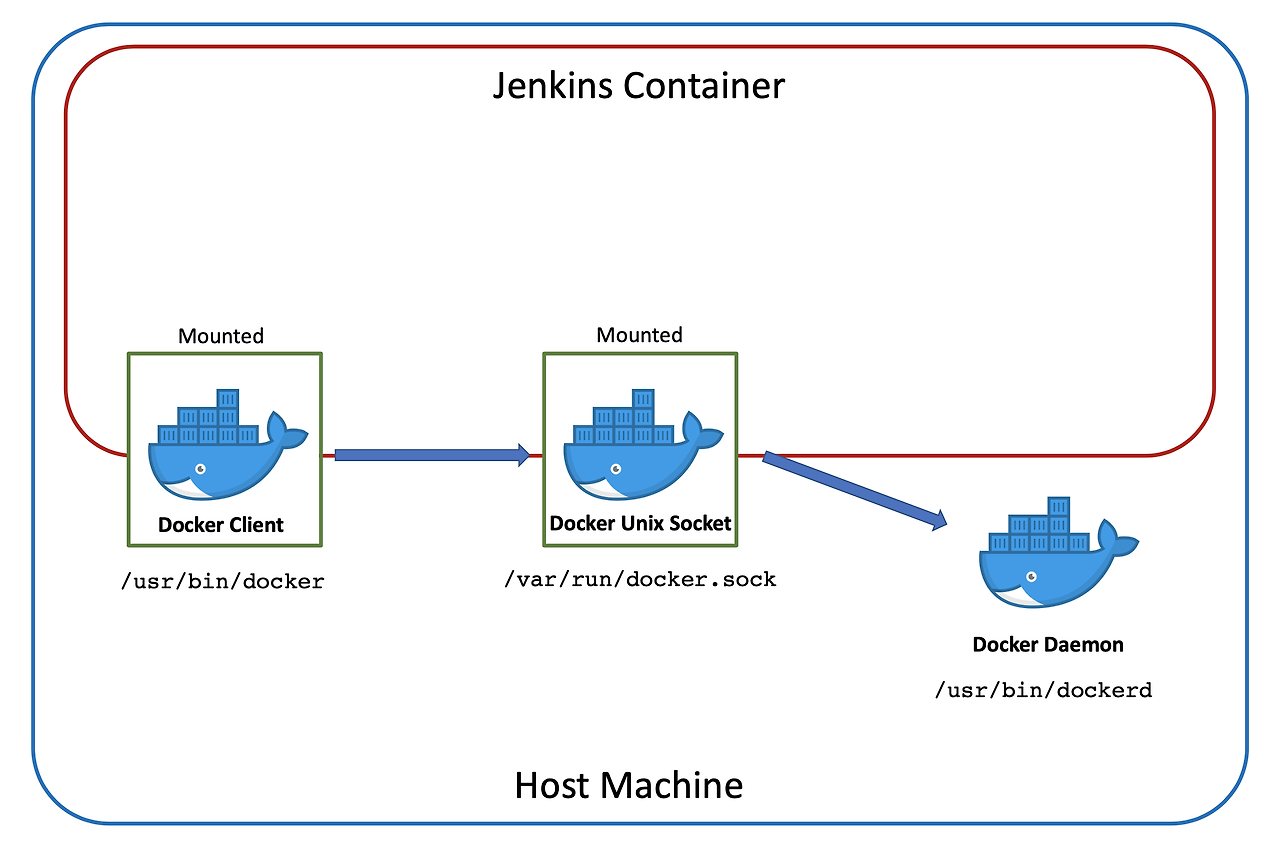 호스트의 Docker Unix 소켓을 Jenkins 컨테이너에 마운트 함으로써 Jenkins 컨테이너는 호스트의 docker 데몬에 액세스 할 수 있다. 반대로 Jenkins 컨테이너에서 생성된 모든 컨테이너/이미지 또한 호스트에서 액세스할 수 있다.