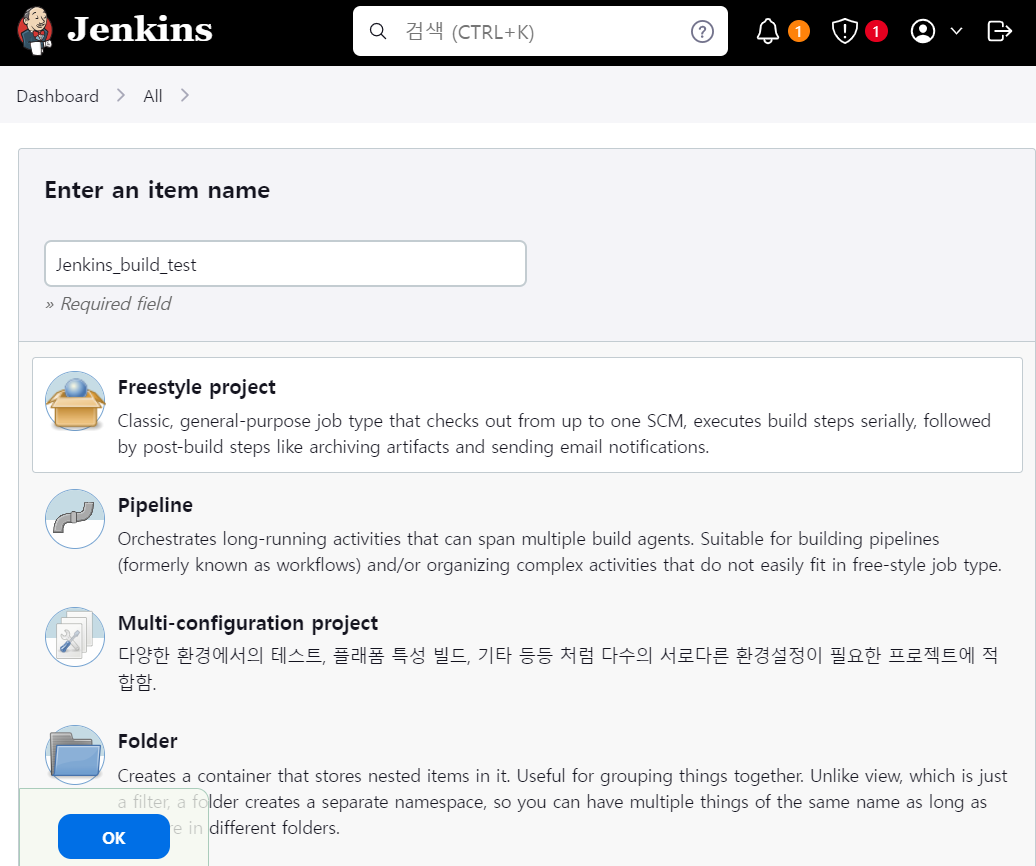 ☞ Jenkins 대시보드 > 새로운 Item > Freestyle Project