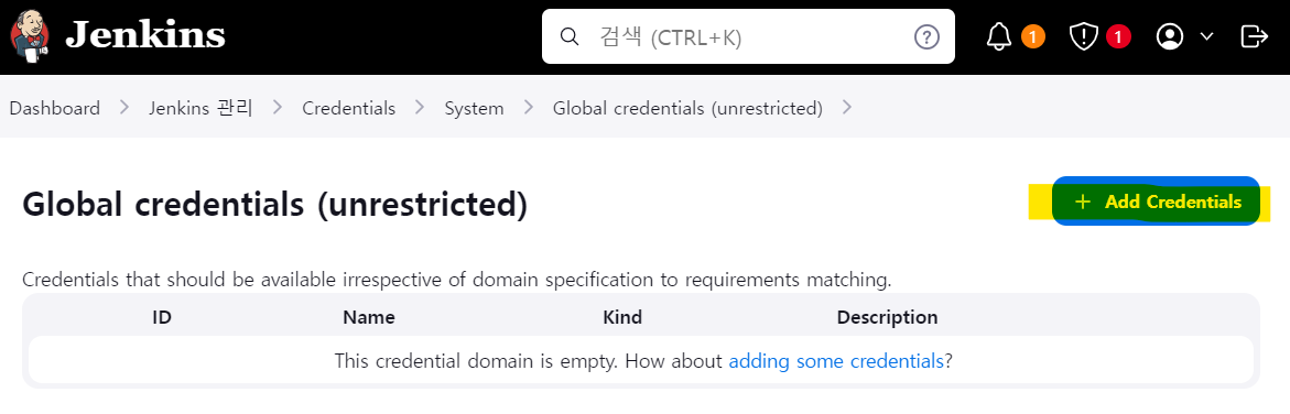 ☞ Jenkins 대시보드 > Jenkins 관리 > Manage Credentials > Credentials 으로 이동해서 Domain이 (global)인 화살표를 눌러 Global credentials (unrestricted)로 이동한다.
