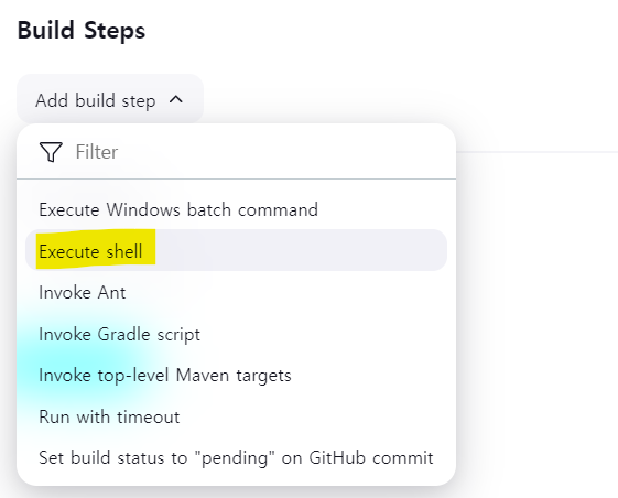 빌드 작업 설정 : build->execute shell 선택하여 빌드스크립트을 작성한다.