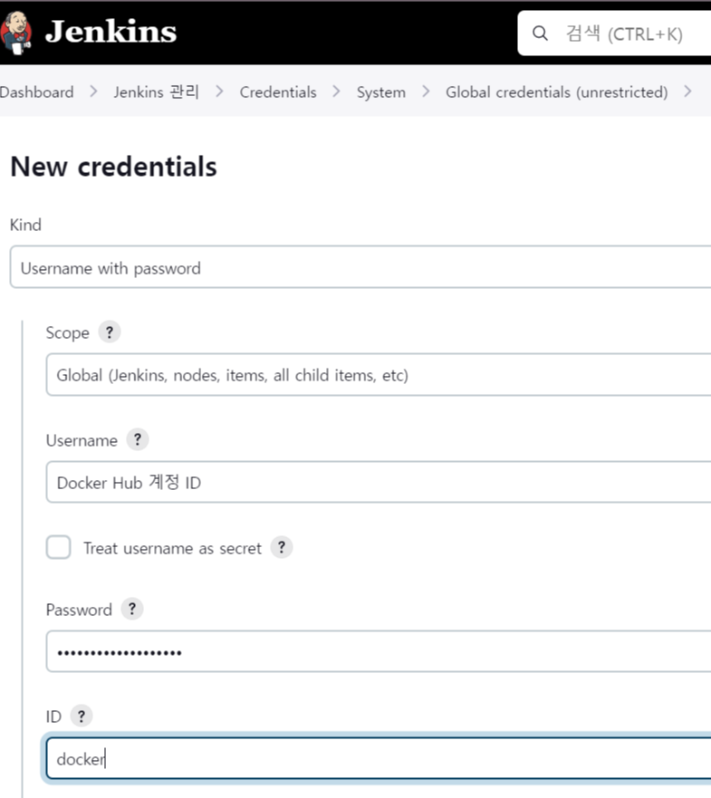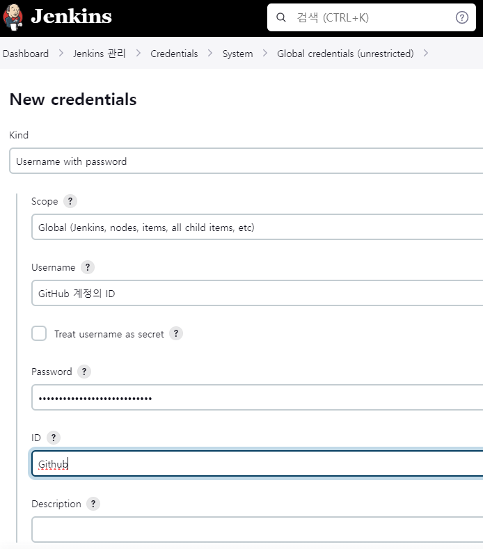 ③ ID : 해당 credentials 식별값 (파이프 라인에서 사용)