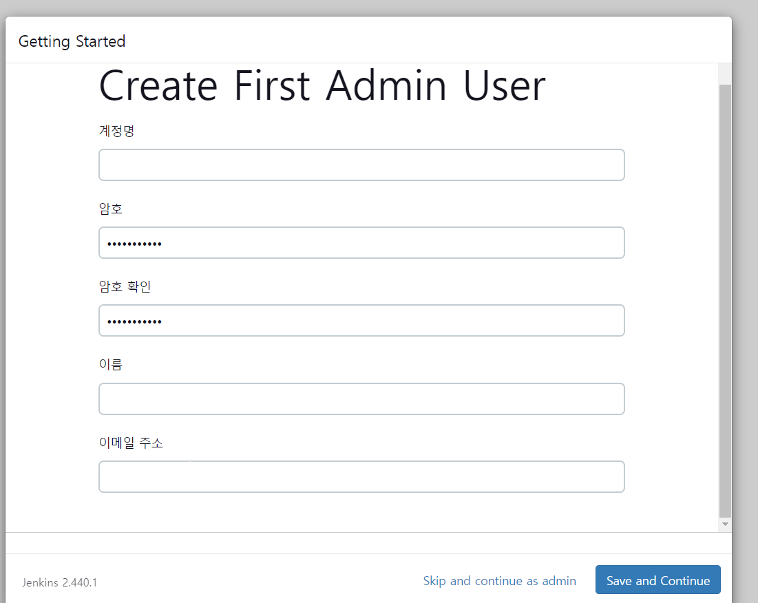 Jenkins 접속 시 사용할 계정을 설정한다. 계정을 생성하면 Instance Configuration 화면이 나타나는데, 이 부분은 그냥 "Save and Finish" 클릭한다.!