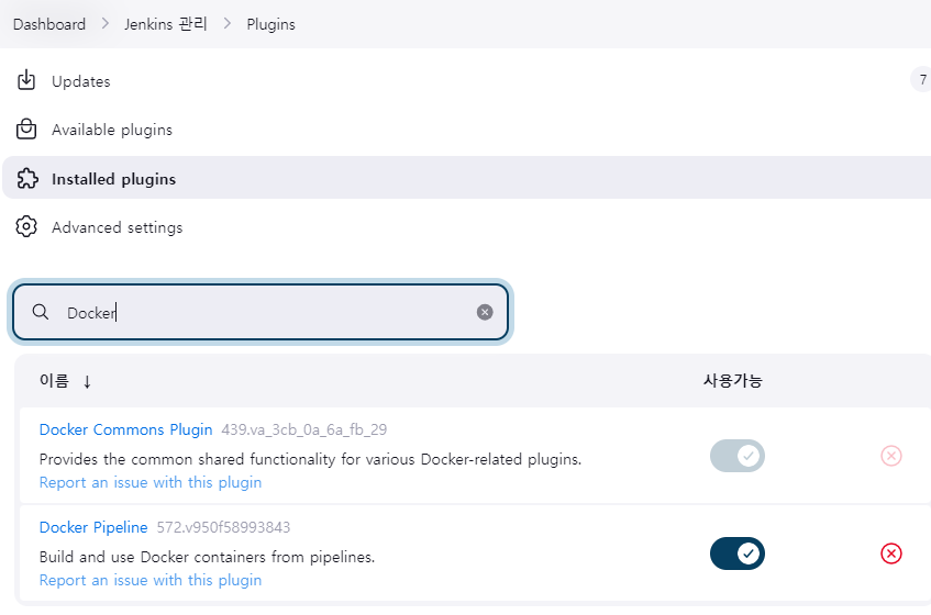 ☞ Dashboard > Jenkins 관리 > 플러그인 관리 > 설치된 플러그인 > docker pipeline 검색