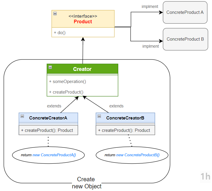 ▶ConcreteCreator : 최상위 Factory Class 의 자식 Class. 팩토리 메서드를 재정의하여 다른 유형의 Product 을 반환한다.