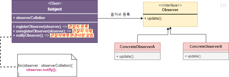 ▶ update(): Subject에서 호출되는 메서드로, Observer에게 상태 변경을 알리는 역할을 한다. 이 메서드는 주로 Subject에서 전달되는 변경된 데이터를 매개변수로 받는다.