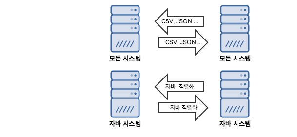 CSV, JSON, 프로토콜 버퍼 등은 시스템의 고유 특성과 상관없는 대부분의 시스템에서의 데이터 교환 시 많이 사용되지만 "자바 직렬화 형태의 데이터 교환은 자바 시스템 간의 데이터 교환을 위해서 존재한다."고 생각하시면 된다.