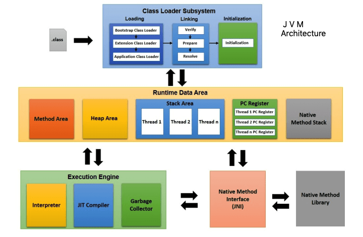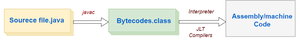 에 의해 Java source(.java) 파일은 Byte code로 변환, 변환된 Byte code(.class) 파일을 JVM 내로 class를 로드하고 Link작업을 통해 배치 등 일련의 작업을 한다. 또 런타임시 class를 load한다.